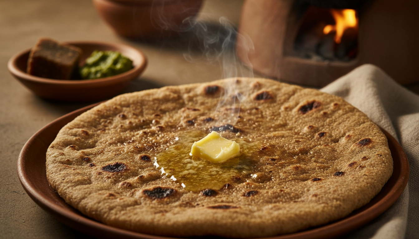 A thick, soft flatbread made from pearl millet (baajri) flour, served warm with butter, garlic chutney, or jaggery.