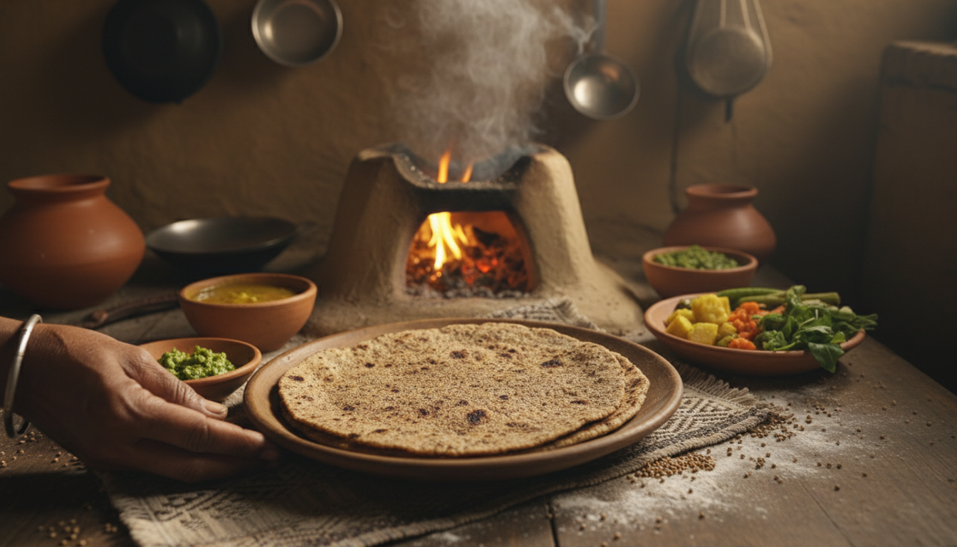 Baajri flour mixed with warm water and hand-rolled into rotlos, cooked over an open flame or clay stove, creating a smoky and rustic aroma.