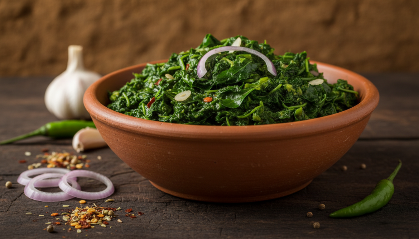 Freshly gathered forest greens like amaranth, spinach, or wild mustard are cooked with garlic, onions, and mild spices for a rich, earthy taste.