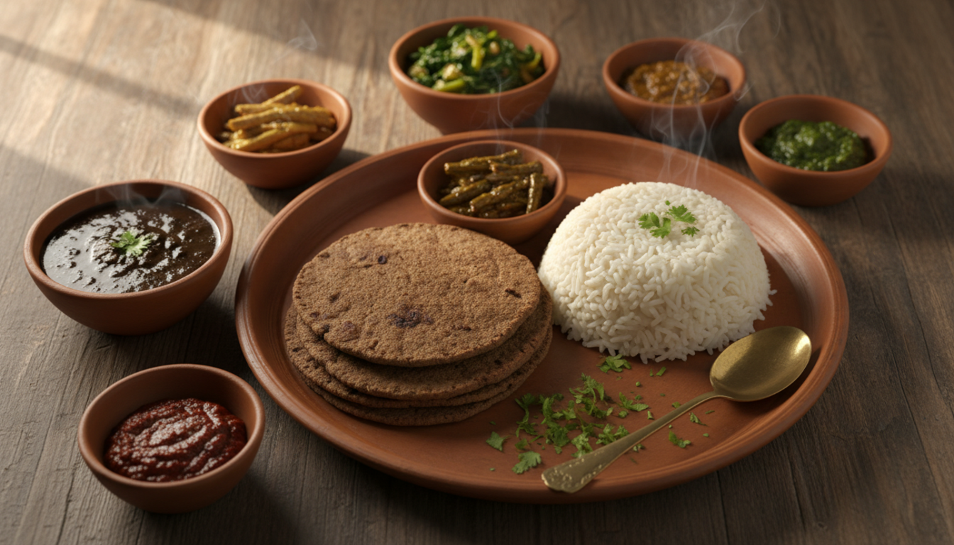 Made from ground finger millet flour, salt, and water, it’s served hot with dal, green chutney, or seasonal vegetables. The simple ingredients make it highly nutritious and filling.